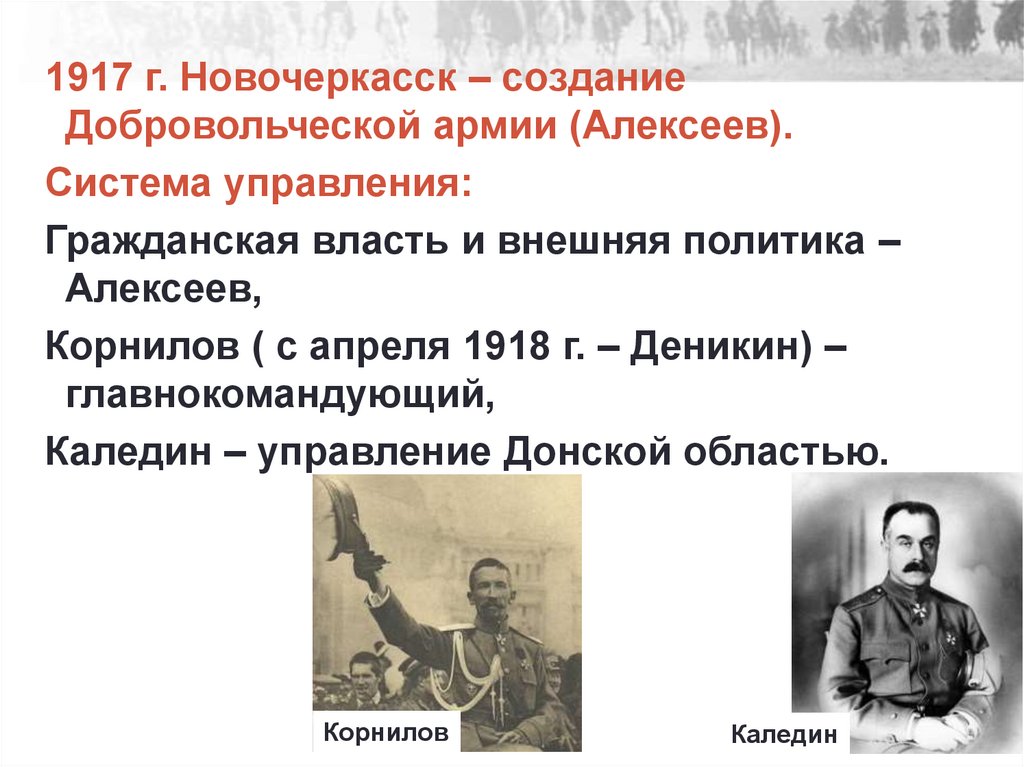 1917 г. Новочеркасск – созданиеДобровольческой армии (Алексеев).