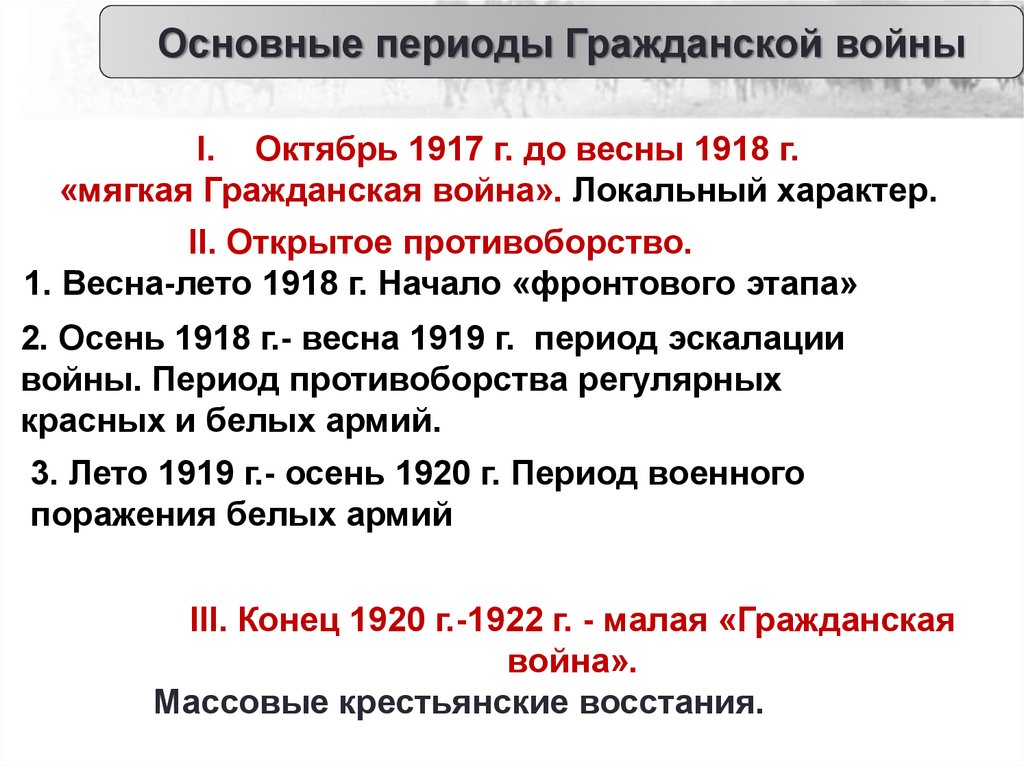 Основные периоды Гражданской войныI. Октябрь 1917 г. до весны 1918 г.