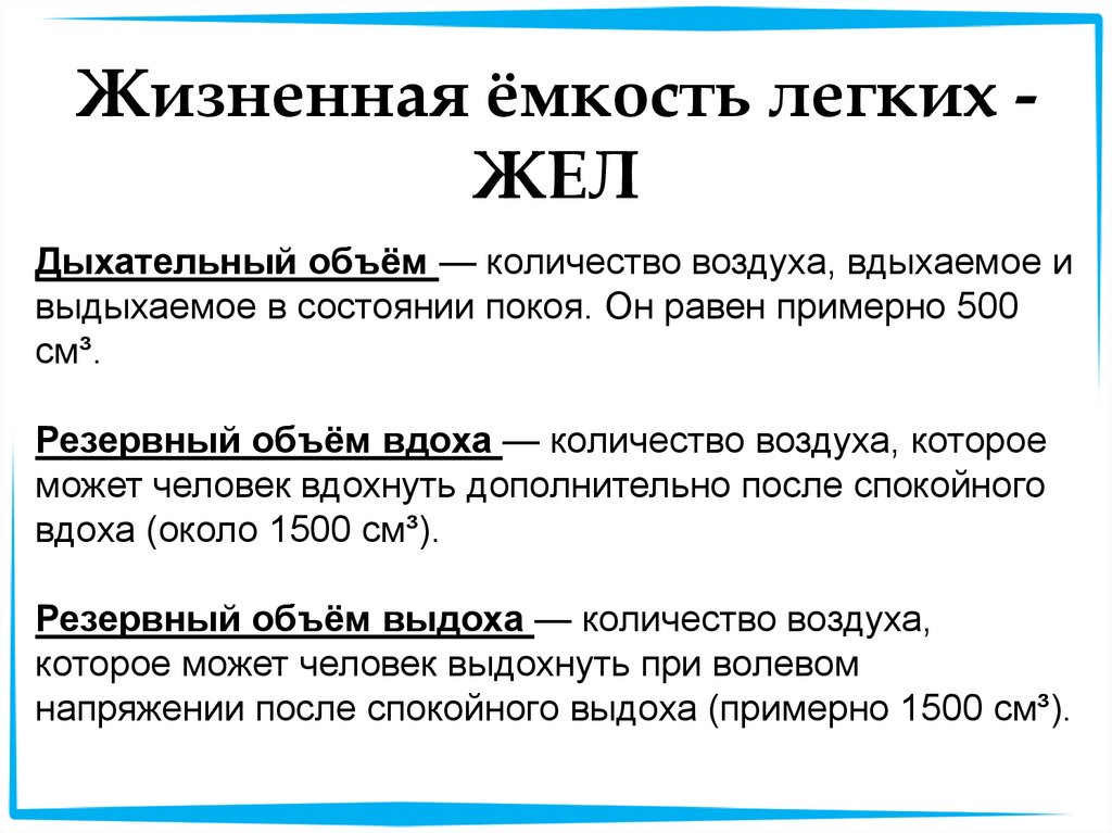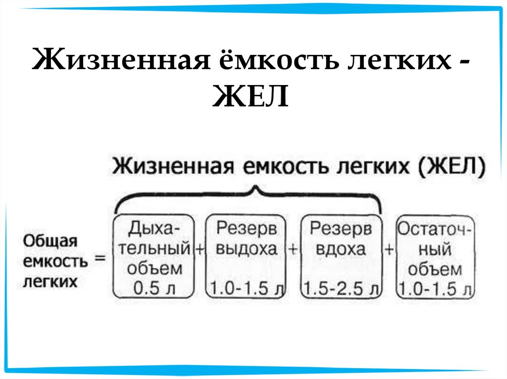Жизненная ёмкость легких ЖЕЛДыхательный объём — количество воздуха, вдыхаемое и