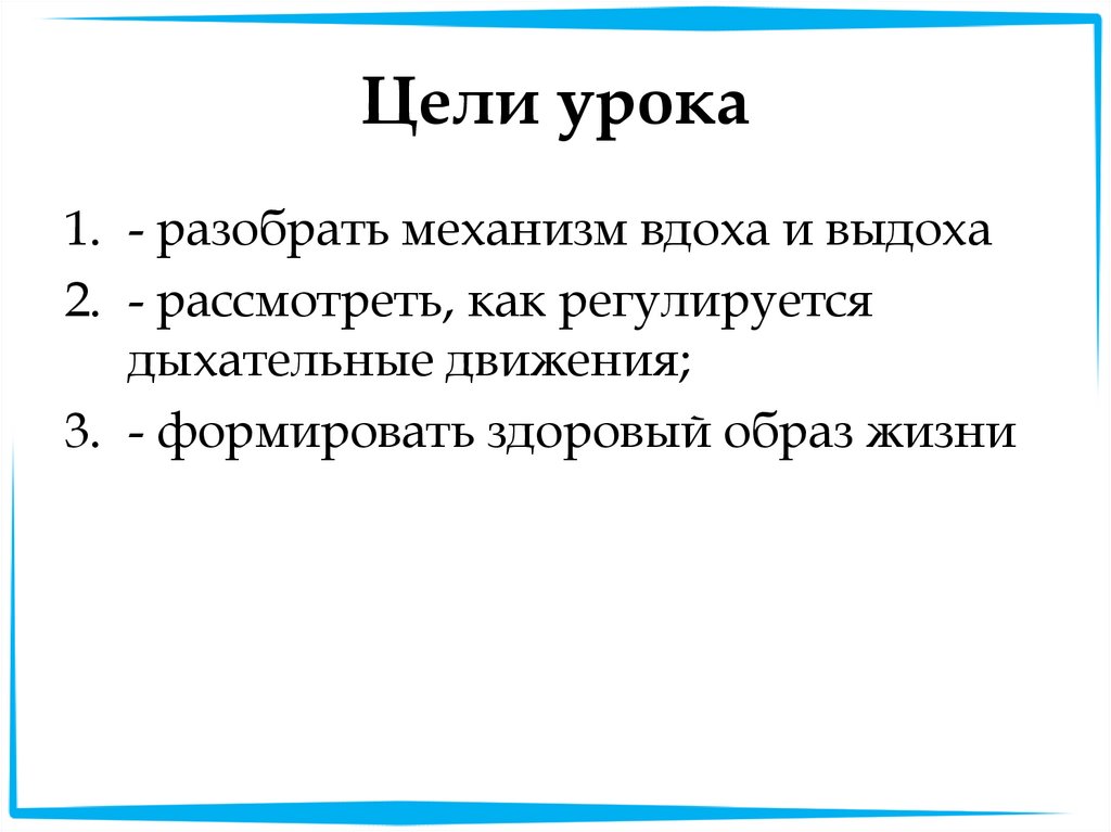 Цели урока1. - разобрать механизм вдоха и выдоха