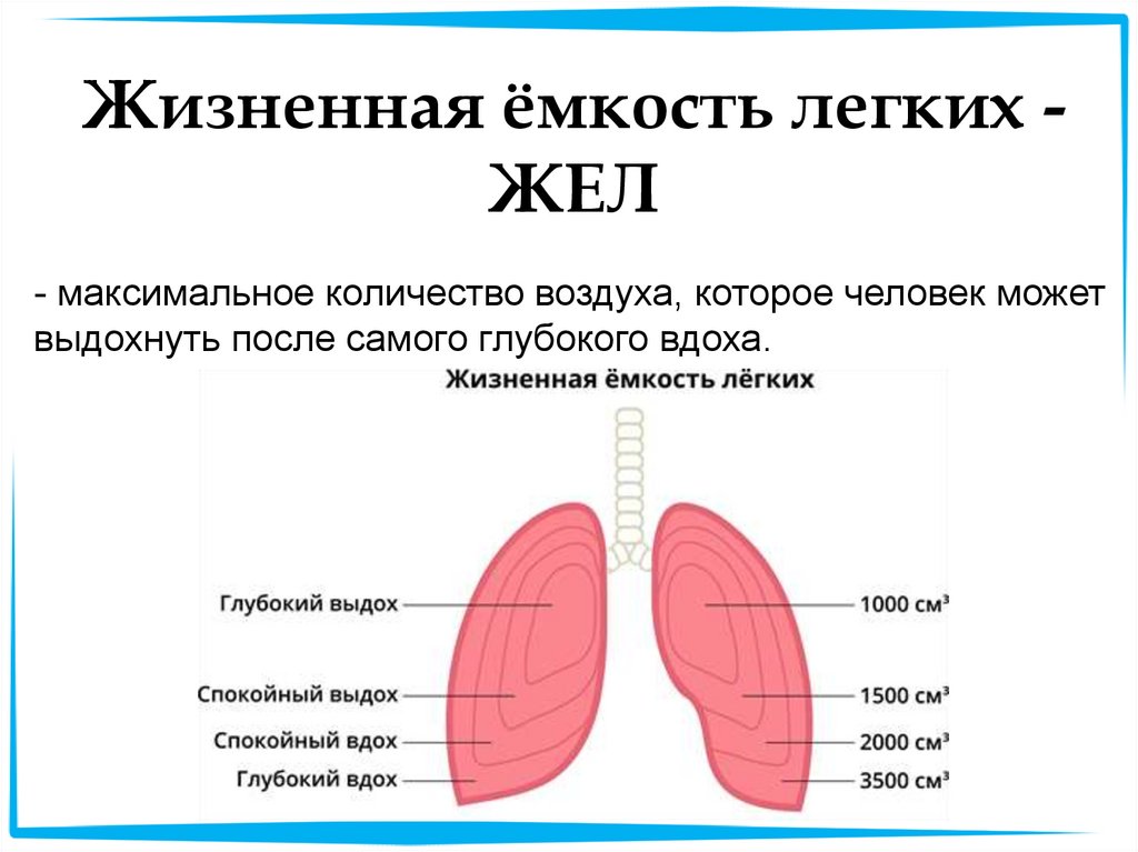 Жизненная ёмкость легких ЖЕЛ- максимальное количество воздуха, которое человек может