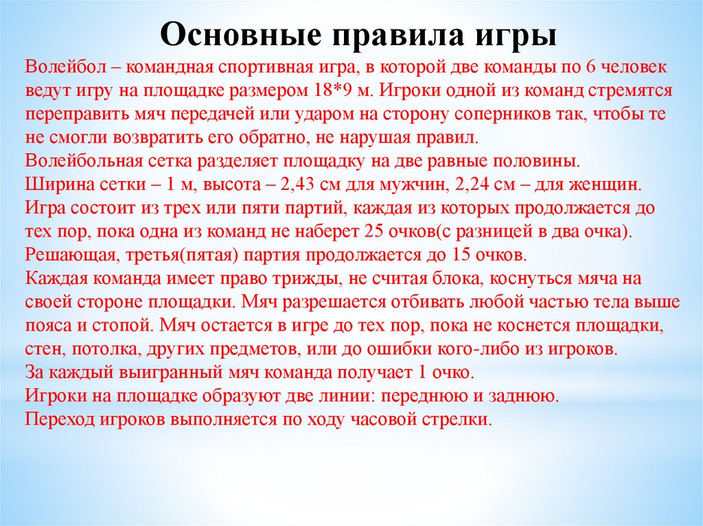 Основные правила игрыВолейбол – командная спортивная игра, в которой две команды по 6 человек
