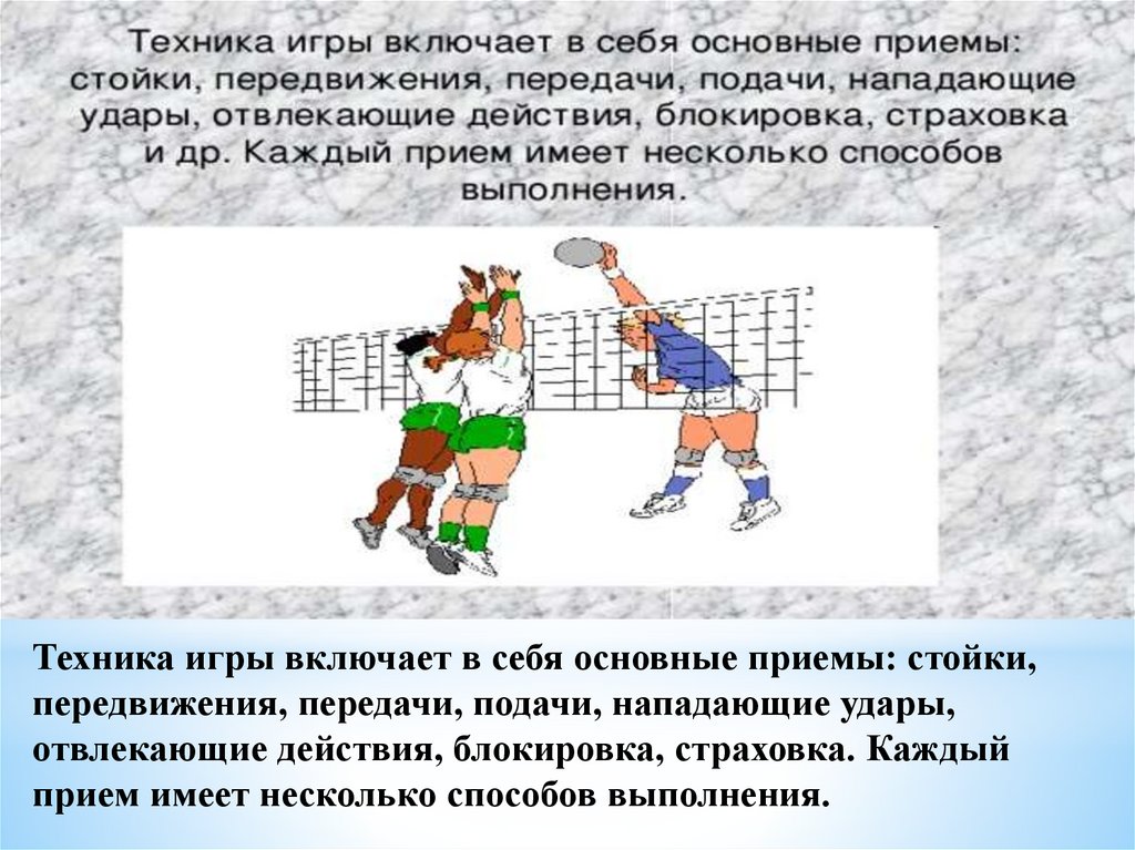 Техника игры включает в себя основные приемы: стойки,передвижения, передачи, подачи, нападающие удары,