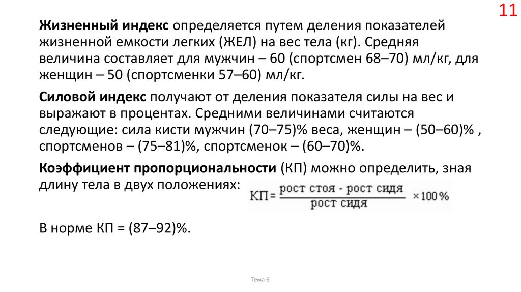 Жизненный индекс определяется путем деления показателейжизненной емкости легких (ЖЕЛ) на вес тела (кг). Средняя