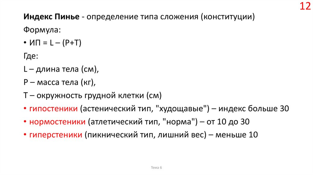 • гиперстеники (пикнический тип, лишний вес) – меньше 10