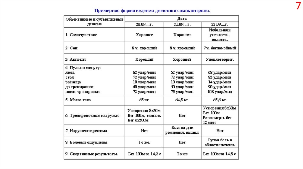 настроение и т.п.) фиксируются в дневнике самоконтроля.