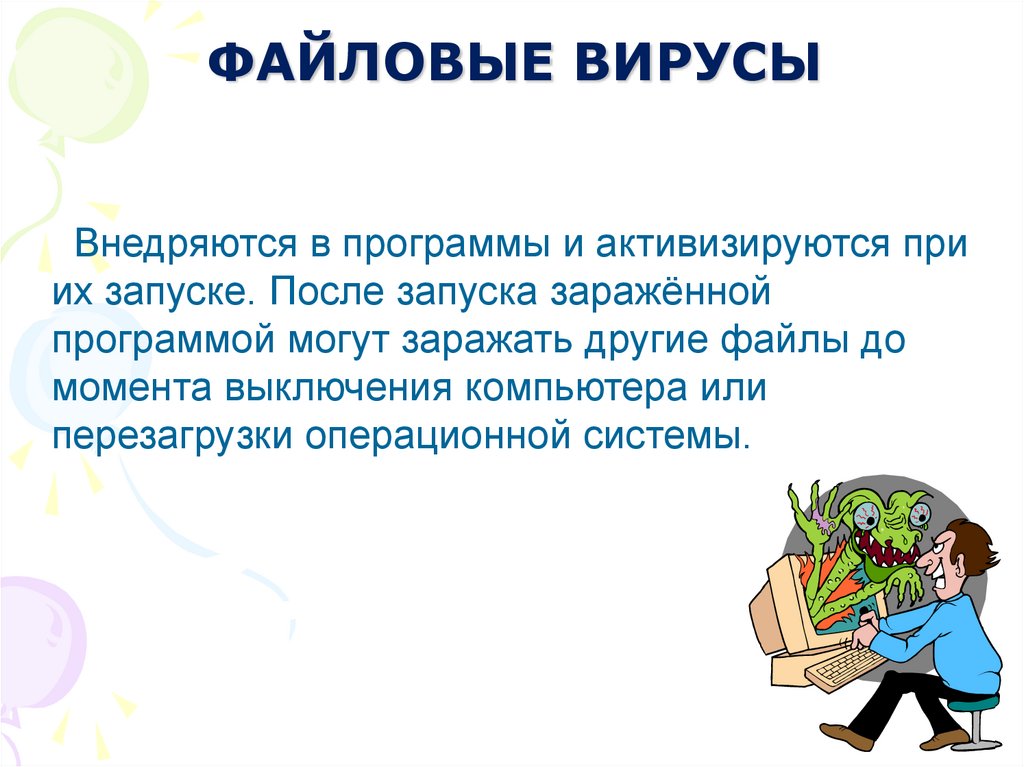 ФАЙЛОВЫЕ ВИРУСЫВнедряются в программы и активизируются при
