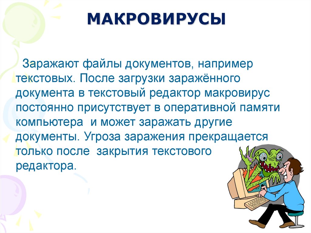 МАКРОВИРУСЫЗаражают файлы документов, например
