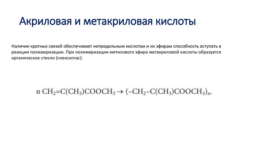 Акриловая и метакриловая кислотыНаличие кратных связей обеспечивает непредельным кислотам и их эфирам способность вступать в