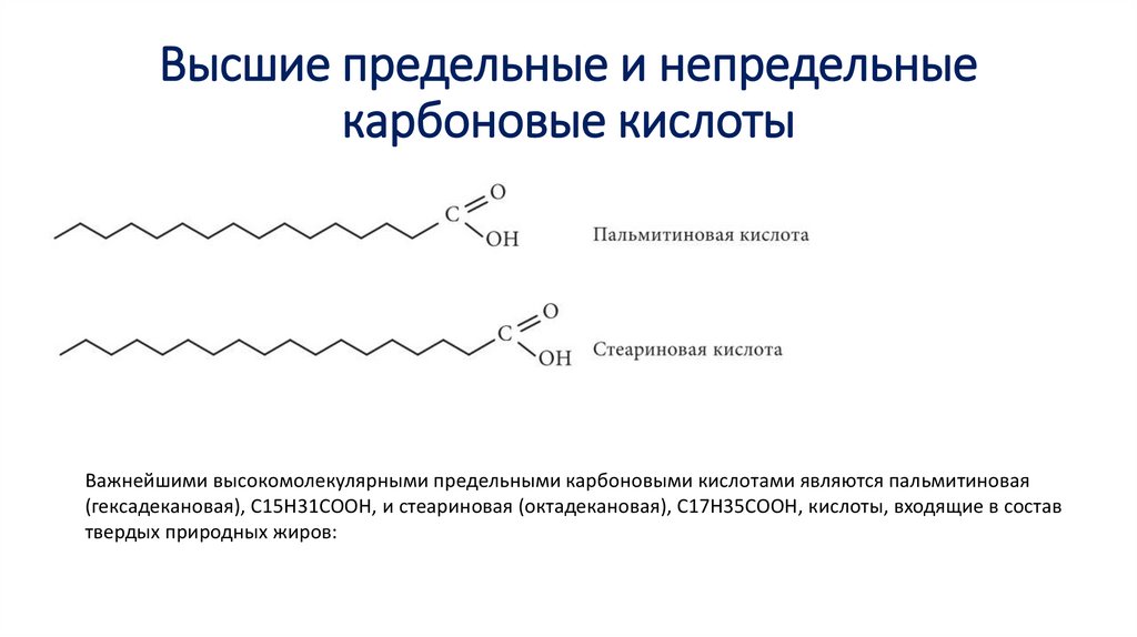 Важнейшими высокомолекулярными предельными карбоновыми кислотами являются пальмитиновая
