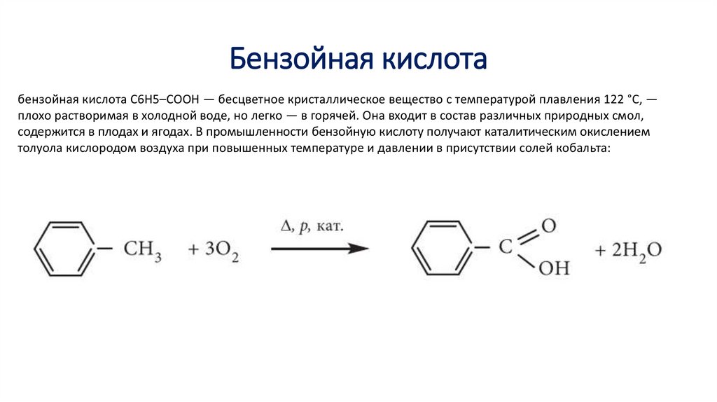 Бензойная кислотабензойная кислота С6Н5–СООН — бесцветное кристаллическое вещество с температурой плавления 122 °С, —
