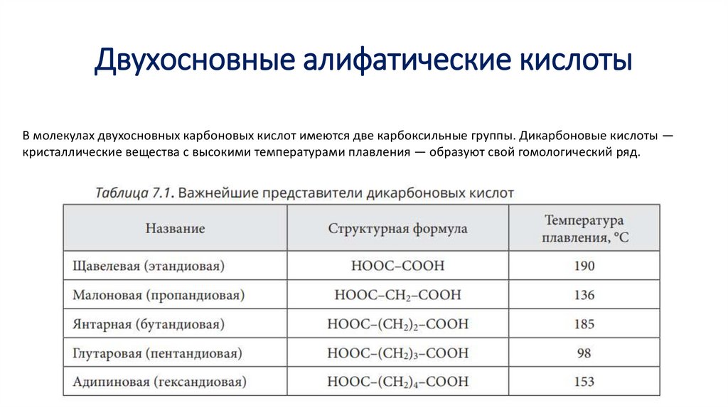 Двухосновные алифатические кислотыВ молекулах двухосновных карбоновых кислот имеются две карбоксильные группы. Дикарбоновые кислоты —