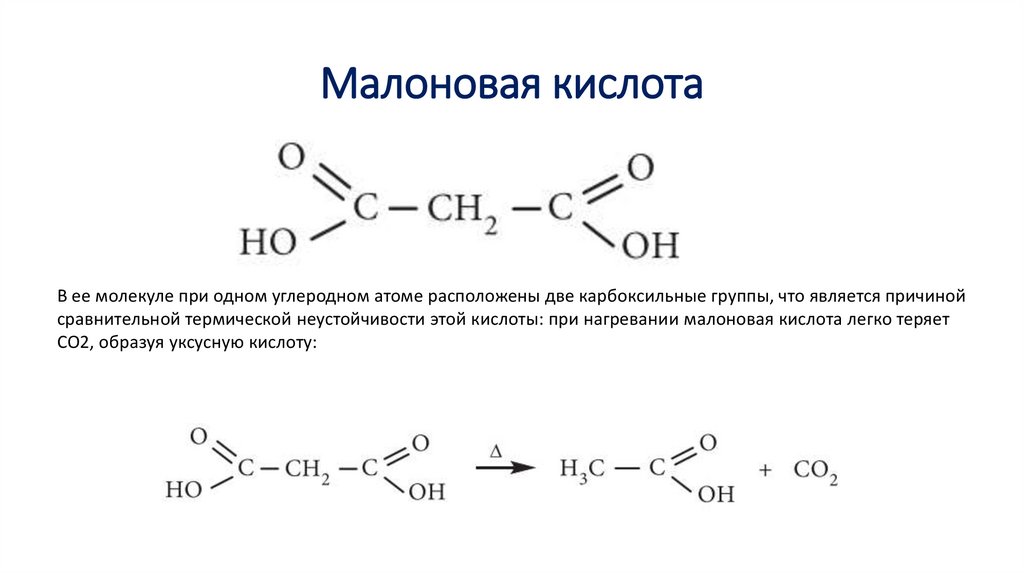 сравнительной термической неустойчивости этой кислоты: при нагревании малоновая кислота легко теряет