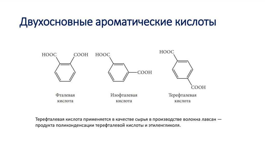 Двухосновные ароматические кислотыТерефталевая кислота применяется в качестве сырья в производстве волокна лавсан —