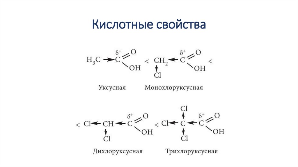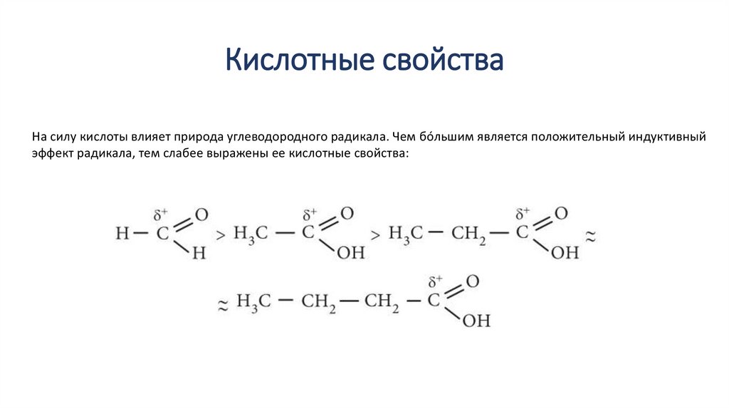 Кислотные свойстваНа силу кислоты влияет природа углеводородного радикала. Чем бóльшим является положительный индуктивный