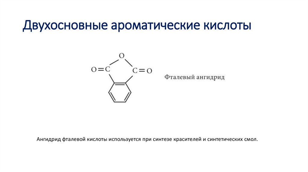 Двухосновные ароматические кислотыАнгидрид фталевой кислоты используется при синтезе красителей и синтетических смол.