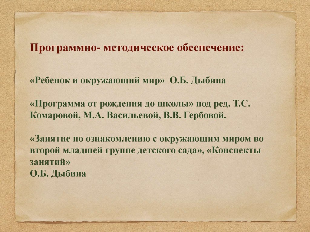 Программно- методическое обеспечение:«Ребенок и окружающий мир» О.Б. Дыбина