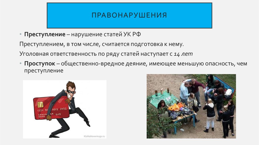 ПРАВОНАРУШЕНИЯ• Преступление – нарушение статей УК РФ
