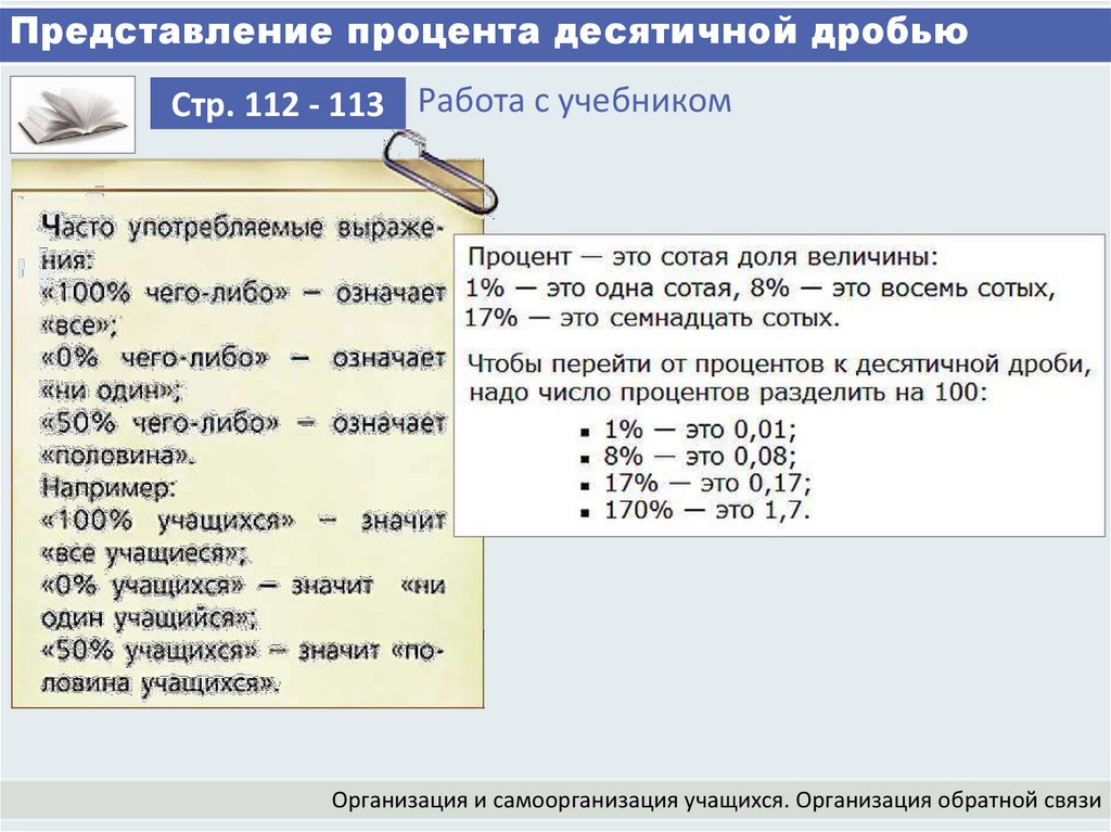 Представление процента десятичной дробьюСтр. 112 - 113 Работа с учебником