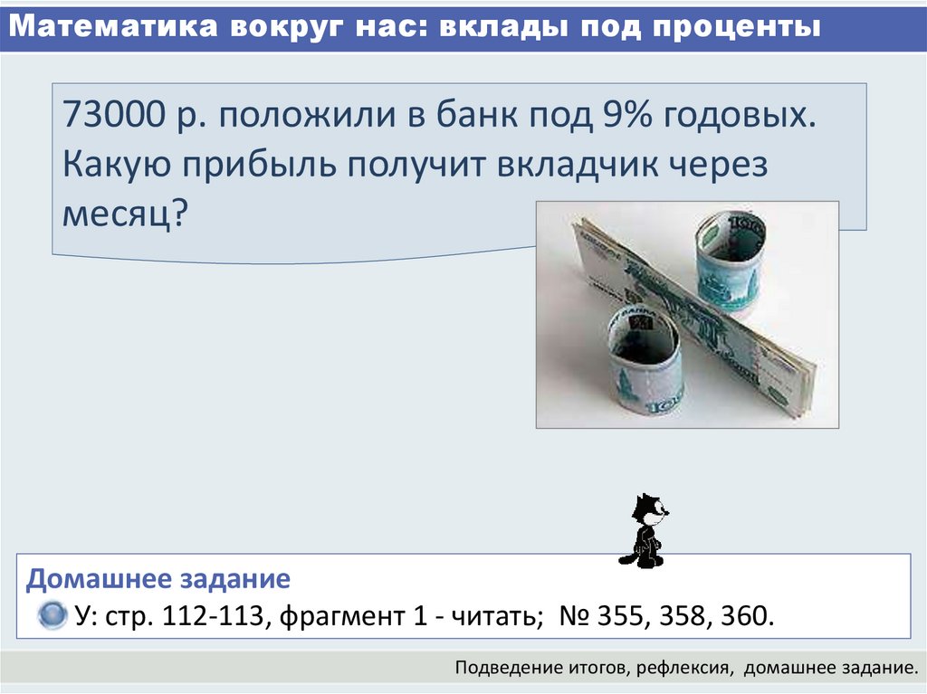 Математика вокруг нас: вклады под проценты73000 р. положили в банк под 9% годовых.