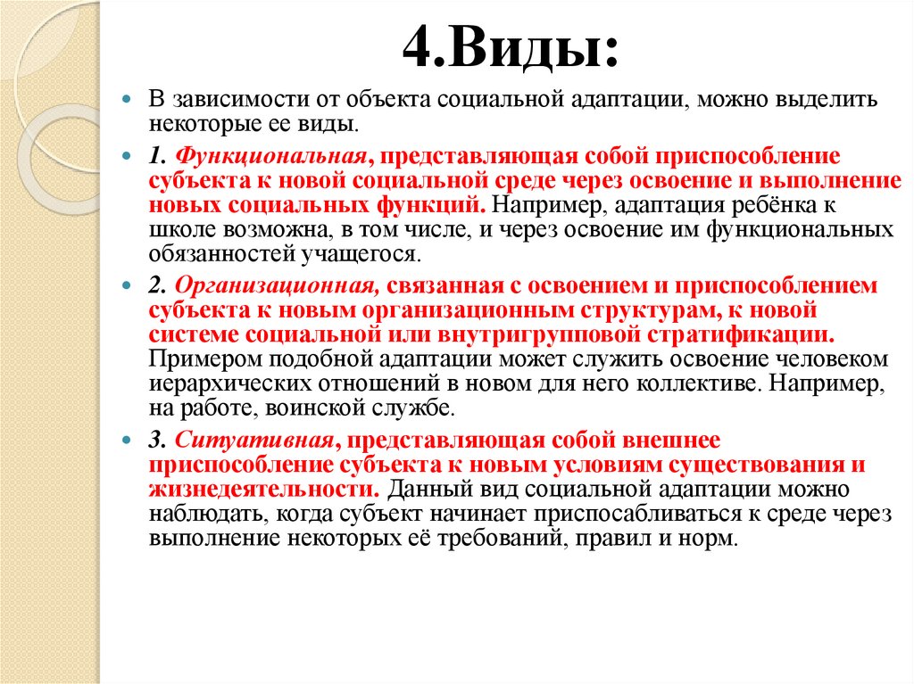 4.Виды:В зависимости от объекта социальной адаптации, можно выделить