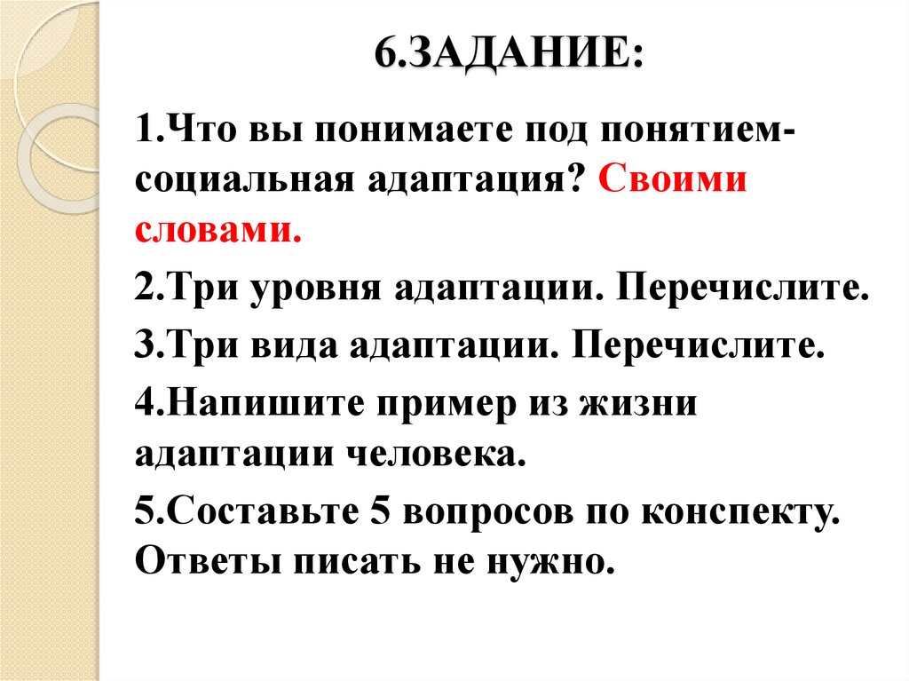 6.ЗАДАНИЕ:1.Что вы понимаете под понятиемсоциальная адаптация? Своими