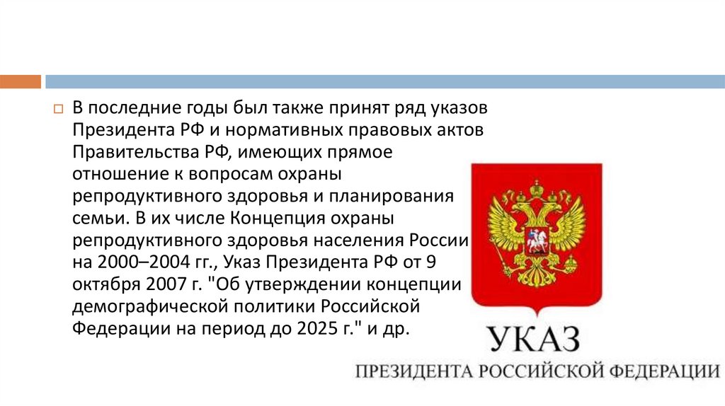 В последние годы был также принят ряд указовПрезидента РФ и нормативных правовых актов