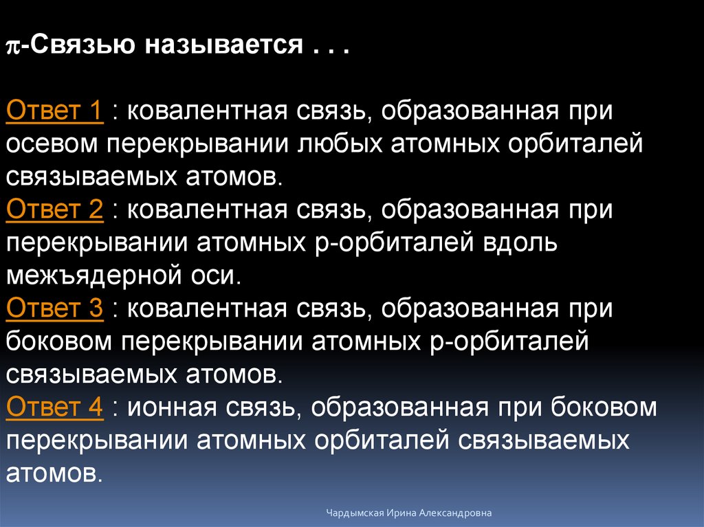 p-Связью называется . . .Ответ 1 : ковалентная связь, образованная при