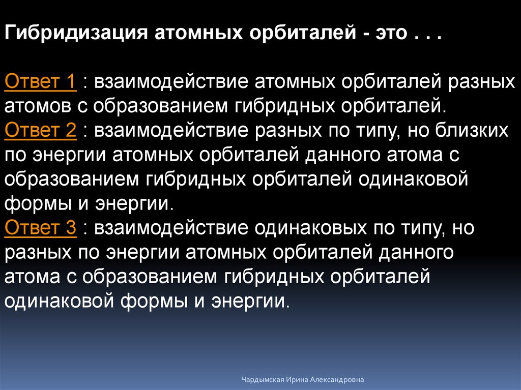 Гибридизация атомных орбиталей - это . . .Ответ 1 : взаимодействие атомных орбиталей разных