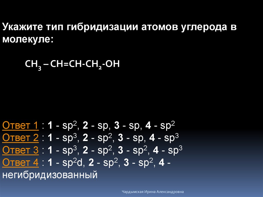 Ответ 1 : 1 - sp2, 2 - sp, 3 - sp, 4 - sp2