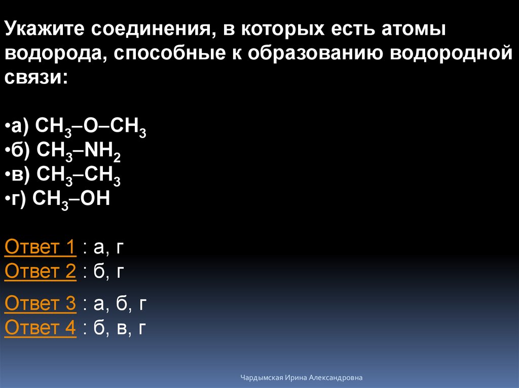 Укажите соединения, в которых есть атомыводорода, способные к образованию водородной