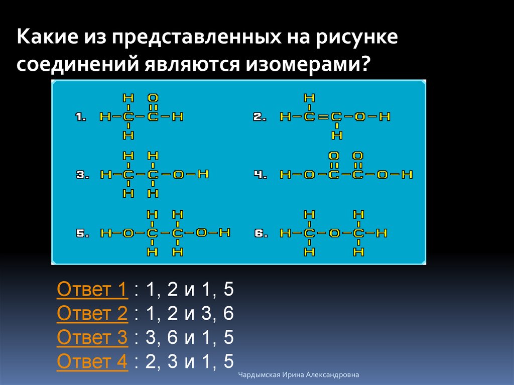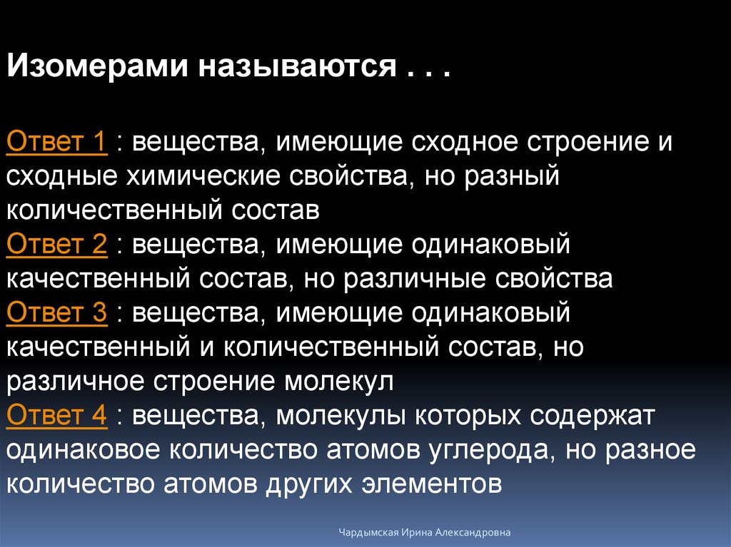 Изомерами называются . . .Ответ 1 : вещества, имеющие сходное строение и