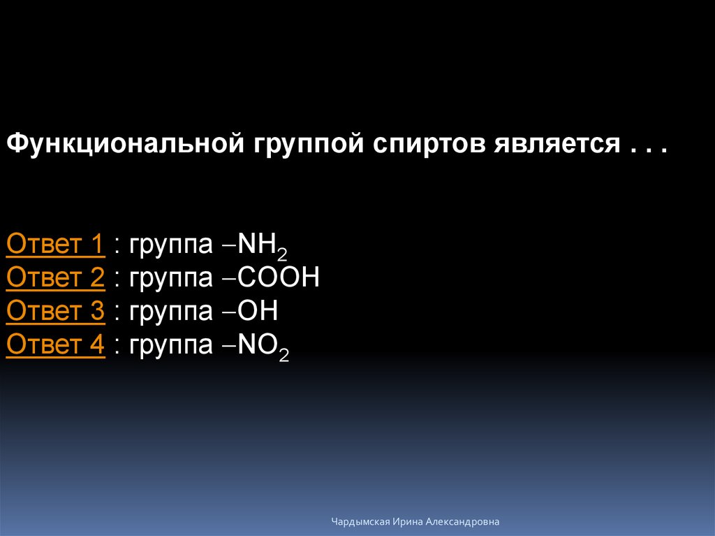 Функциональной группой спиртов является . . .Ответ 1 : группа -NH2