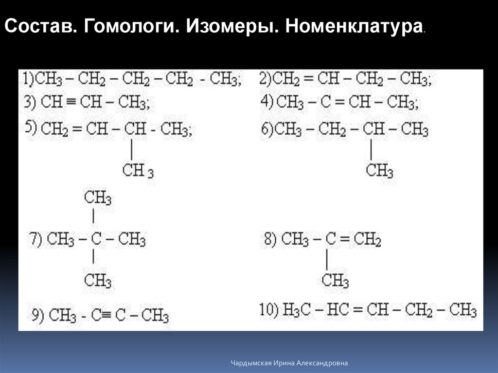 Состав. Гомологи. Изомеры. НоменклатураЧардымская Ирина Александровна