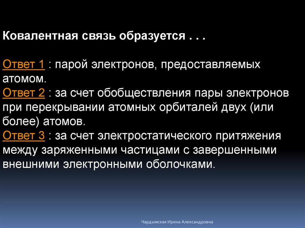 Ковалентная связь образуется . . .Ответ 1 : парой электронов, предоставляемых