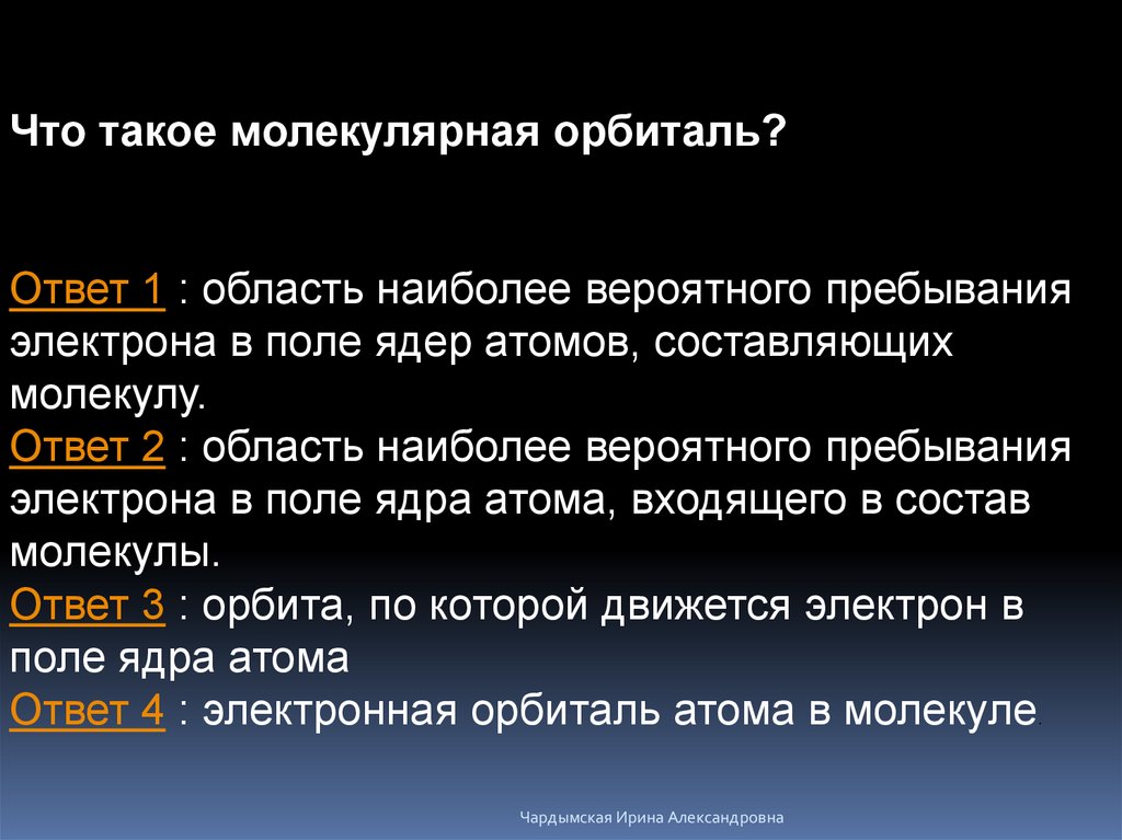 Что такое молекулярная орбиталь?Ответ 1 : область наиболее вероятного пребывания