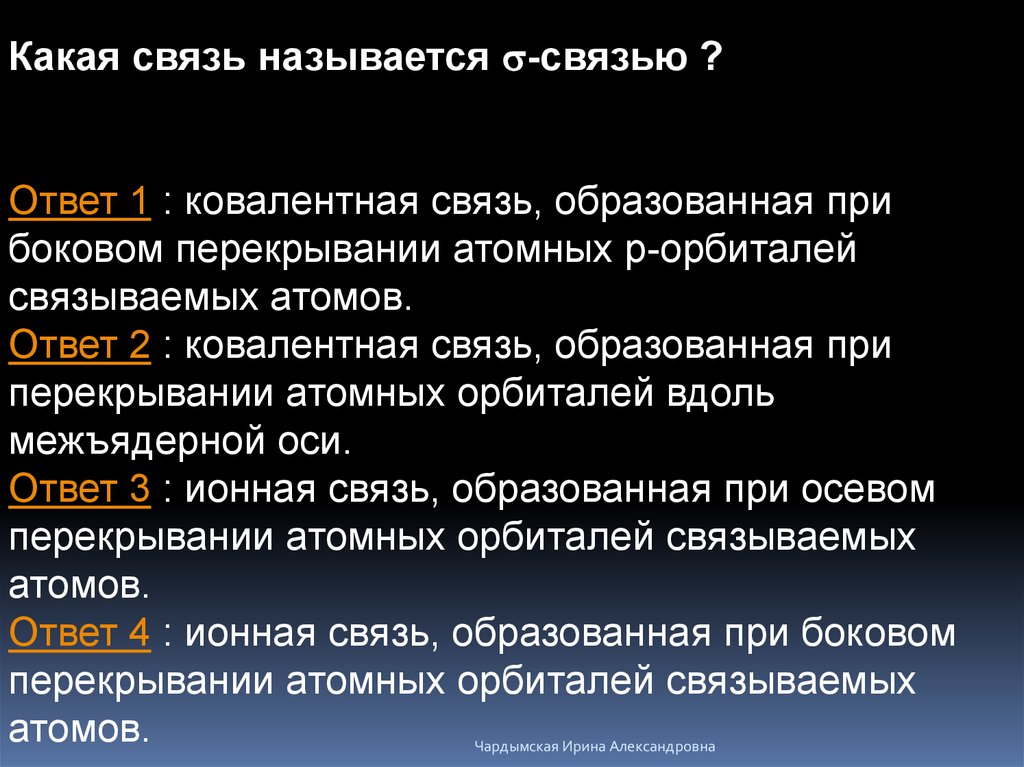 Какая связь называется s-связью ?Ответ 1 : ковалентная связь, образованная при