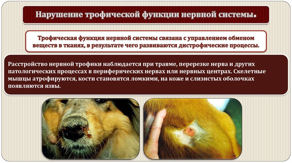 Расстройство нервной трофики наблюдается при травме, перерезке нерва и другихпатологических процессах в периферических нервах или нервных центрах. Скелетные
