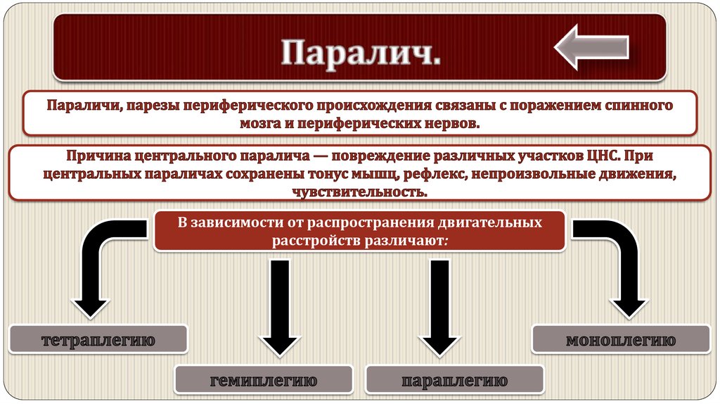 В зависимости от распространения двигательныхрасстройств различают:
