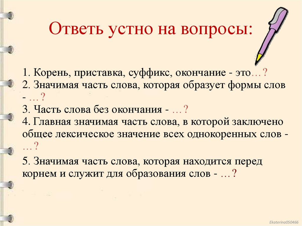 Ответь устно на вопросы:1. Корень, приставка, суффикс, окончание - это…?