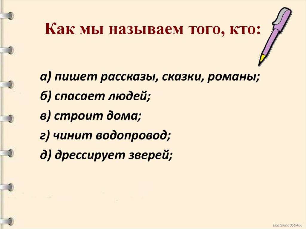 Как мы называем того, кто:а) пишет рассказы, сказки, романы;