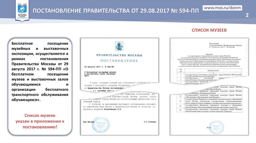 ПОСТАНОВЛЕНИЕ ПРАВИТЕЛЬСТВА ОТ 29.08.2017 № 594-ППСПИСОК МУЗЕЕВ