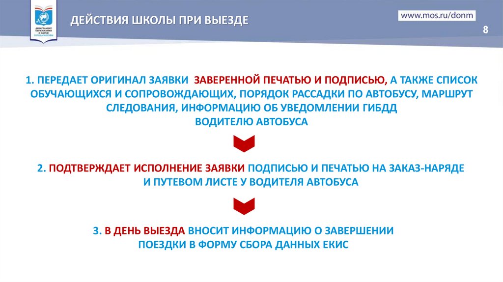 ДЕЙСТВИЯ ШКОЛЫ ПРИ ВЫЕЗДЕ1. ПЕРЕДАЕТ ОРИГИНАЛ ЗАЯВКИ ЗАВЕРЕННОЙ ПЕЧАТЬЮ И ПОДПИСЬЮ, А ТАКЖЕ СПИСОК