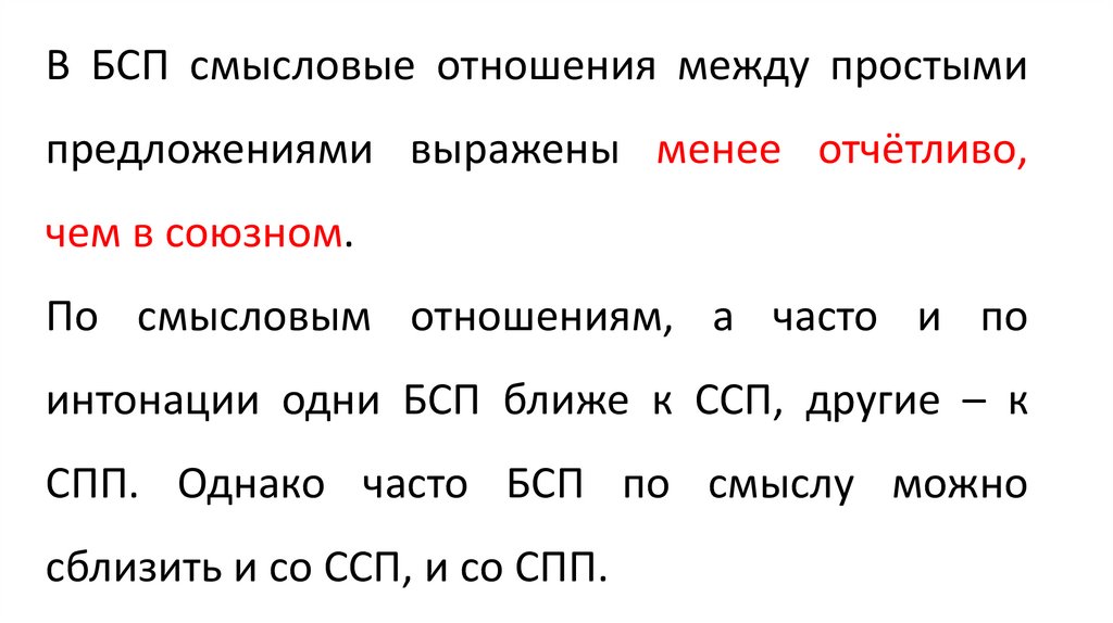 В БСП смысловые отношения между простымипредложениями выражены менее отчётливо,