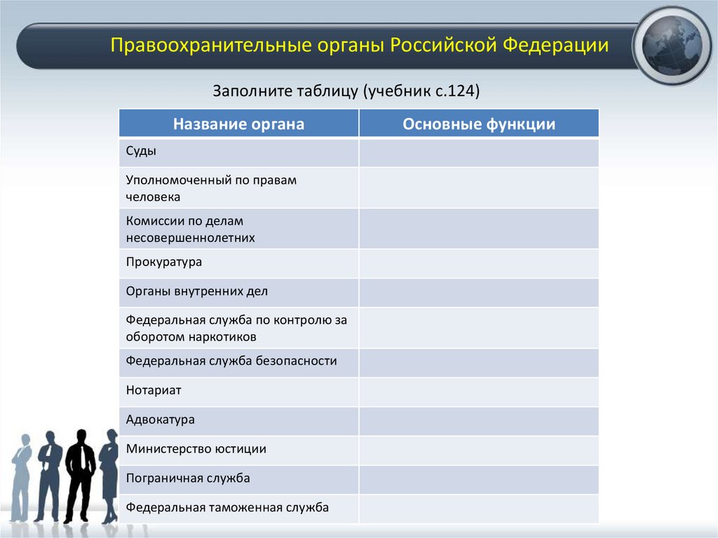 Правоохранительные органы Российской ФедерацииЗаполните таблицу (учебник с.124)