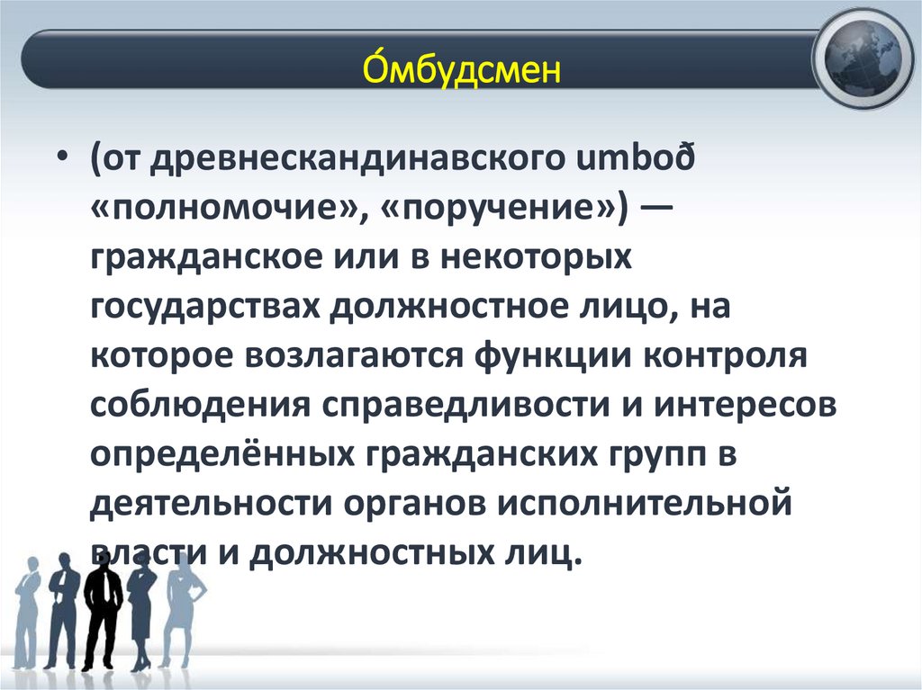 О́мбудсмен• (от древнескандинавского umboð