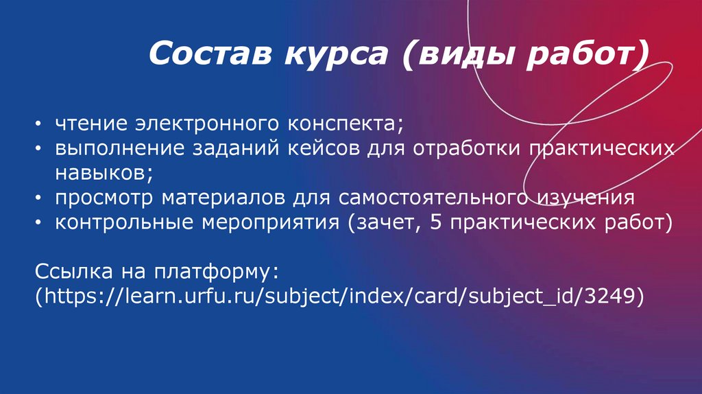 Состав курса (виды работ)• чтение электронного конспекта;