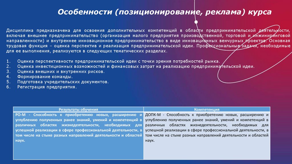 Особенности (позиционирование, реклама) курсаДисциплина предназначена для освоения дополнительных компетенций в области предпринимательской деятельности,