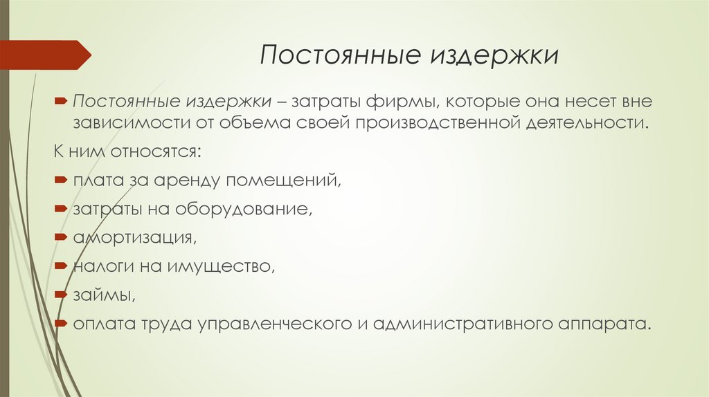 Постоянные издержкиПостоянные издержки – затраты фирмы, которые она несет вне