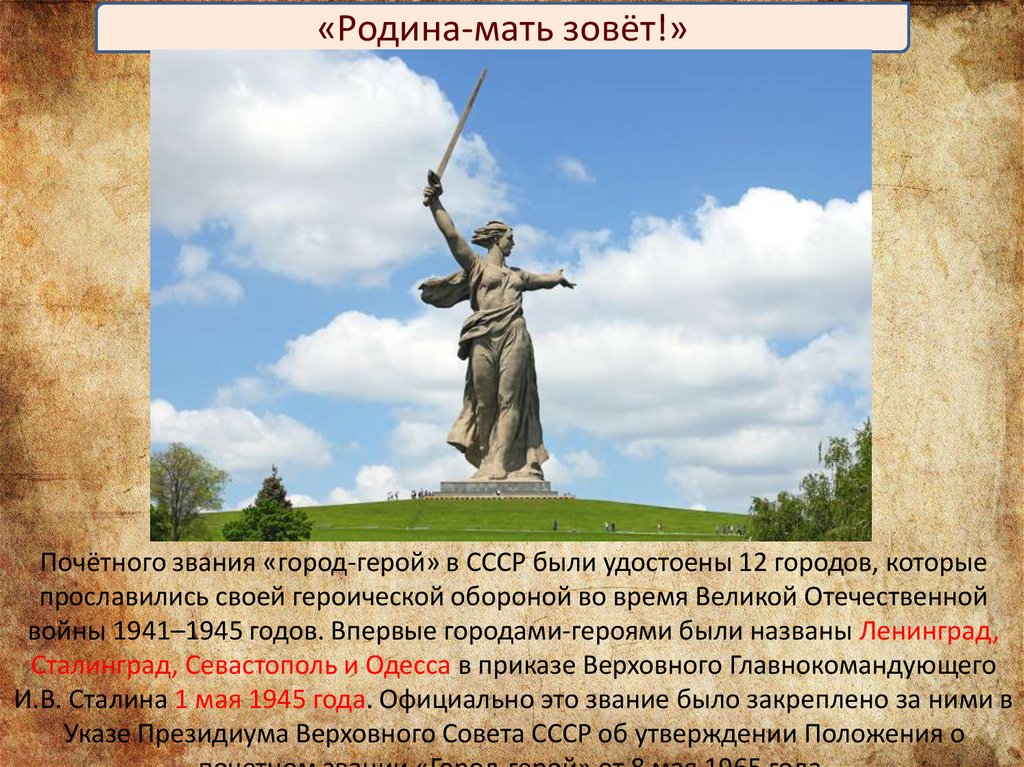 «Родина-мать зовёт!»Почётного звания «город-герой» в СССР были удостоены 12 городов, которые